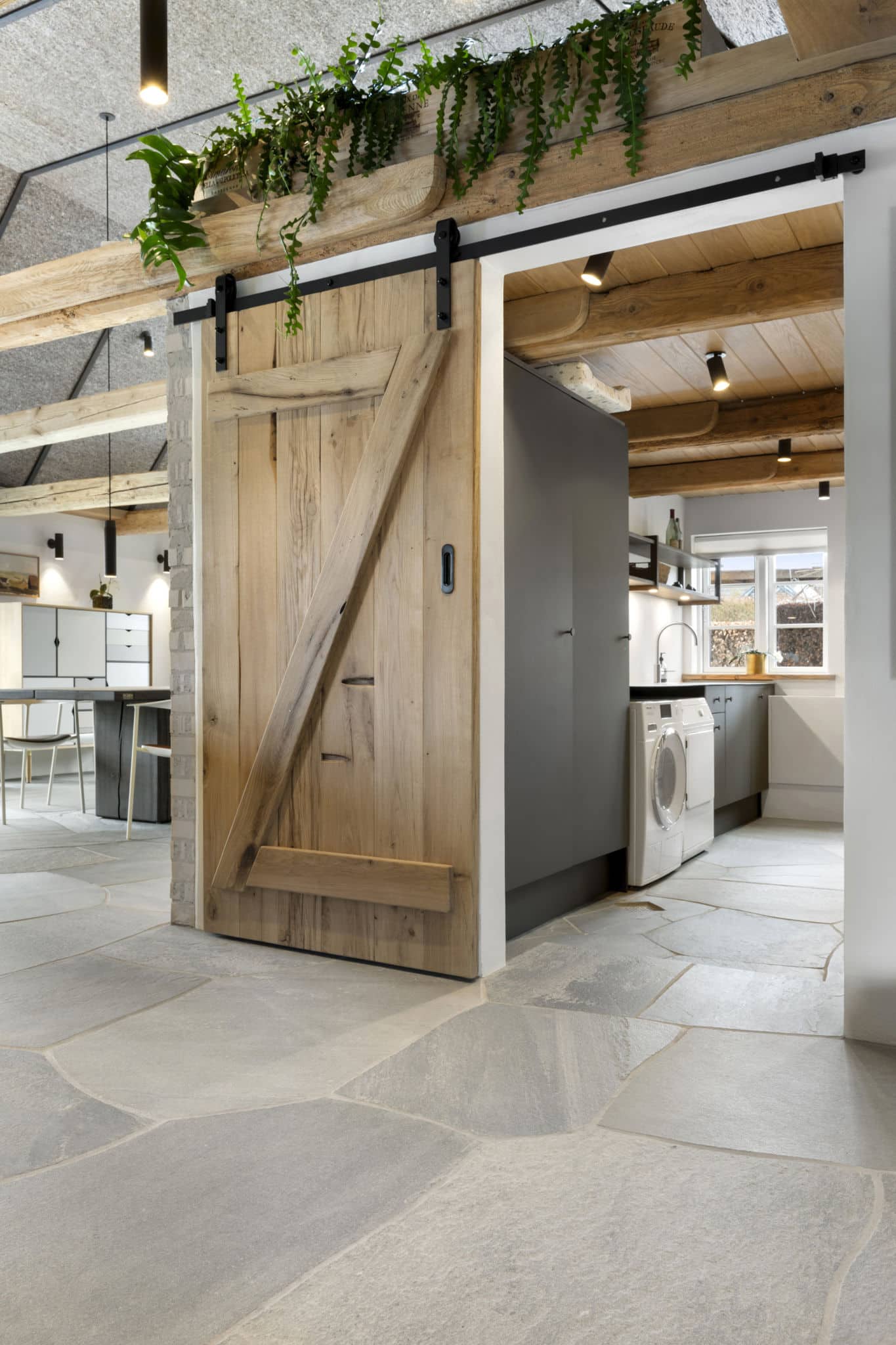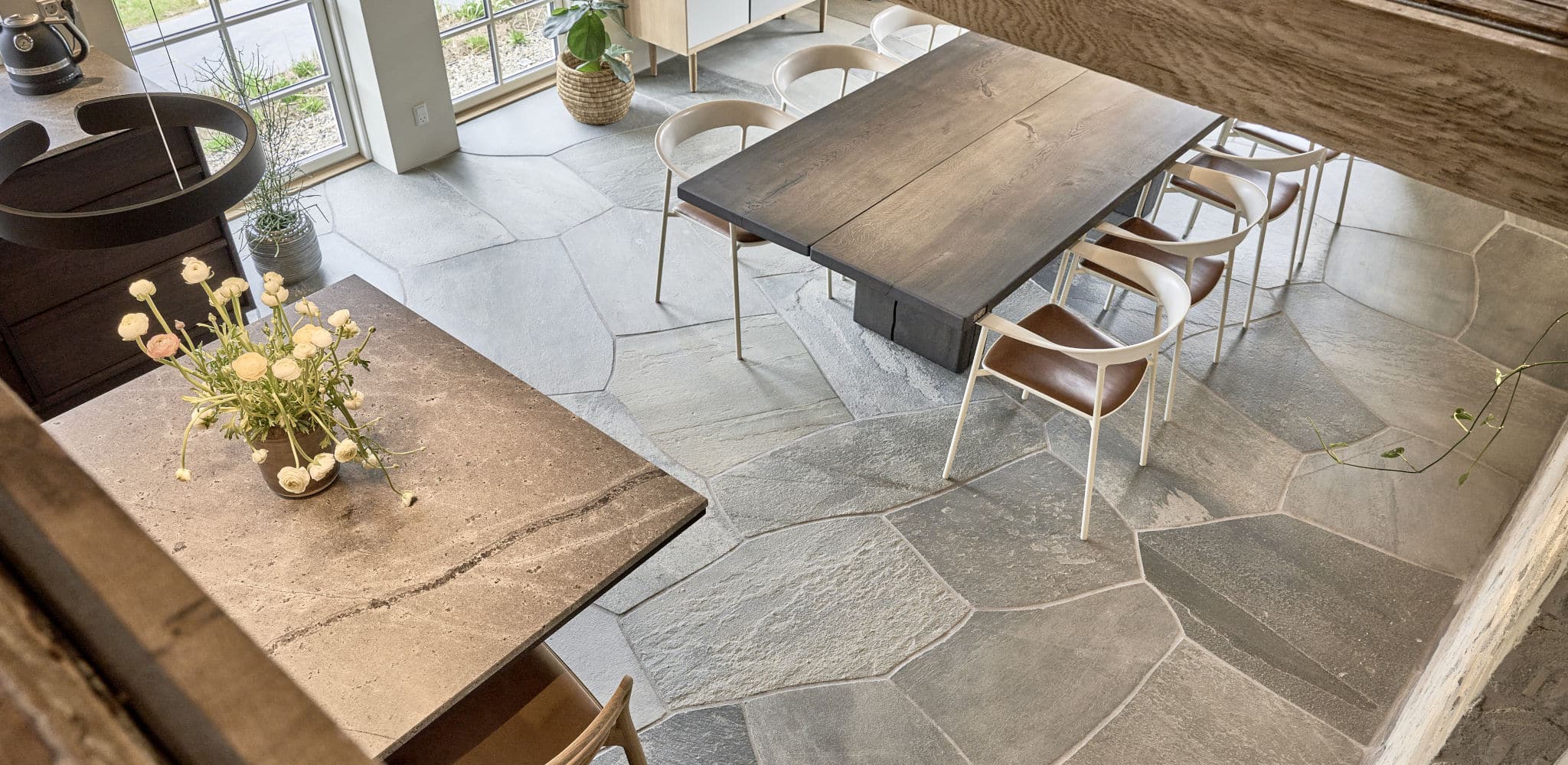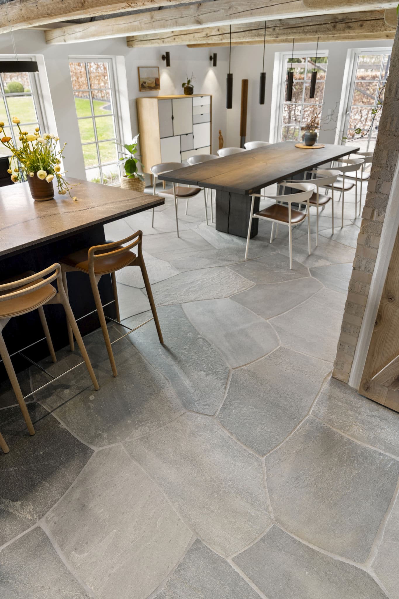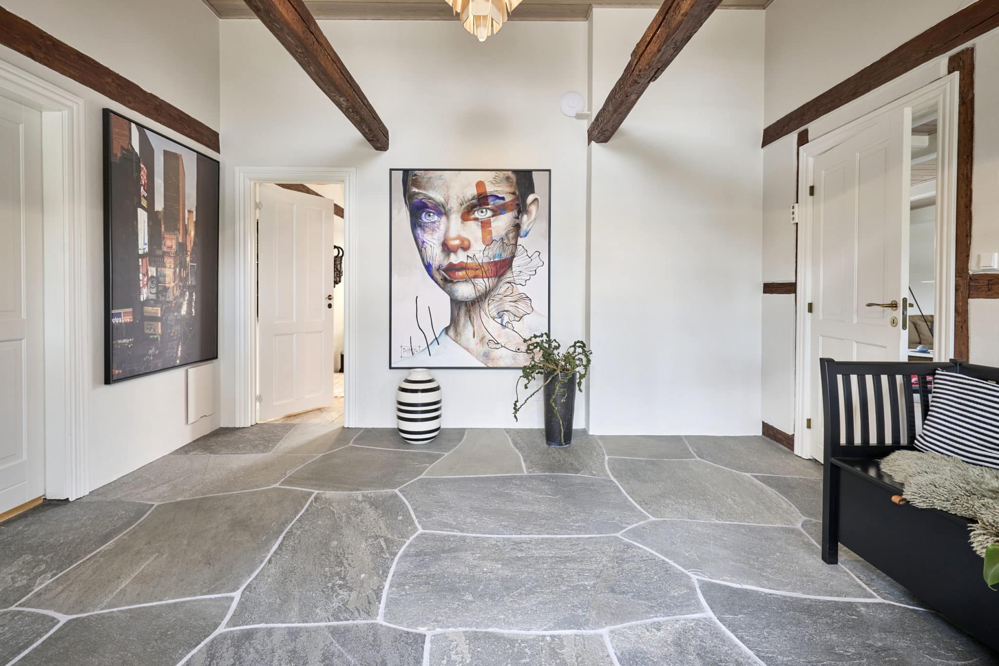 Norwegian Flagstone Classic was delivered and installed in the fall of 2024. The slate is carefully adapted to the rooms and walls that in the old building were not completely straight or at an angle. The natural surface, colour nuances and uneven shapes give the floor a warm and timeless feeling that fits perfectly into the building’s historical expression.